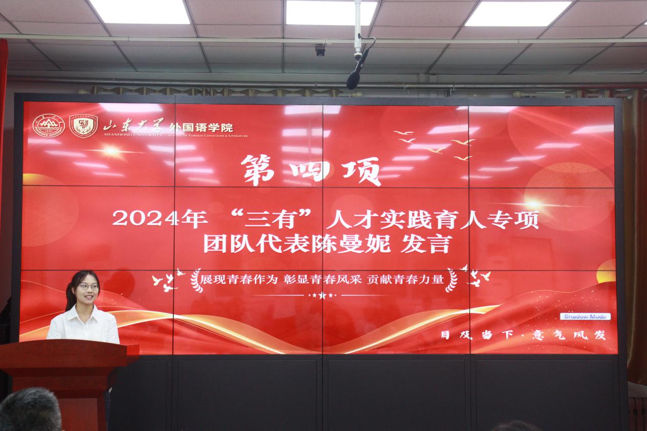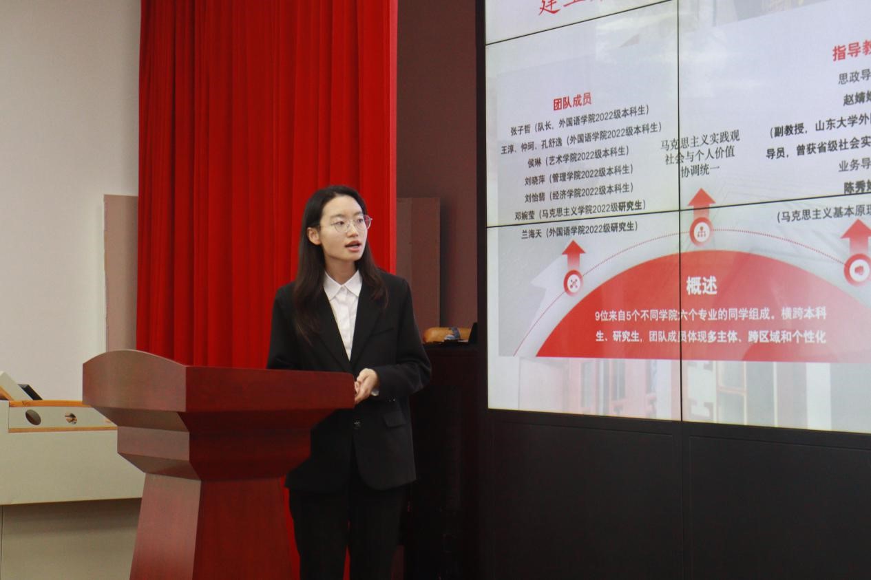 2023年社会实践优秀团队代表张子哲同学发言。她从总领方案,实施过程 ,责任体系,创新精神多个方面汇报,向同学们分享了自己的实践经验。同时她希望同学们珍惜本次实践机会,全力以赴,以实际行动展现外院学子风采。