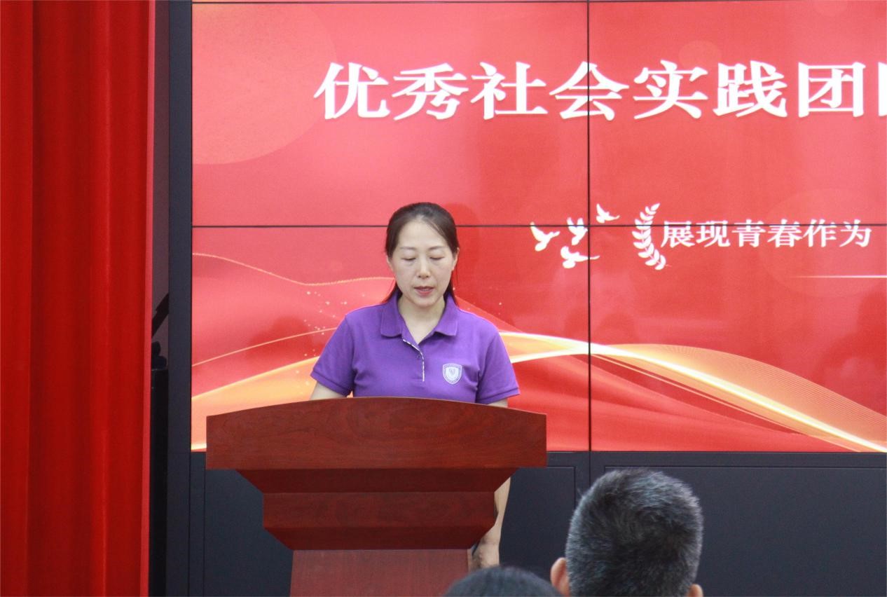 社会实践团队优秀指导教师代表赵婧婧发言。她从“明确方向,理清意义”“珍惜资源,全力以赴”“安全第一,确保底线”三方面给同学们建议。她表示,社会实践是培养学生综合素质的有效途径,鼓励学生们充分利用暑假时间,深入基层,了解社会,勇于实践,甘于奉献,为构建和谐家园奉献青春力量。