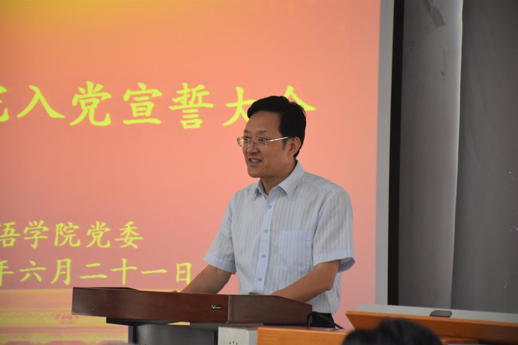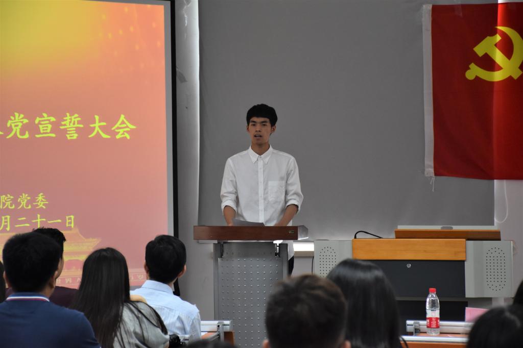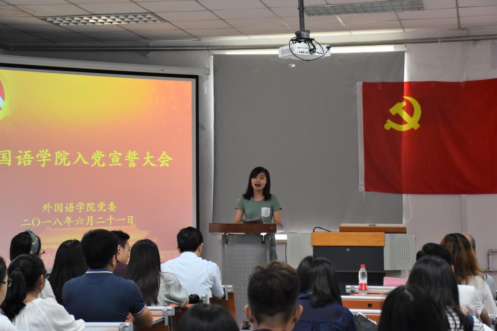 本次活动在《国际歌》的歌声中正式开始。首先,党委组织员周俊基带领全体党员面向党旗庄严宣誓。铿锵有力的宣誓声彰显了青年党员砥砺前行的决心和勇气。宣誓完毕之后,预备党员代表,青年思想理论协会会长、2016级朝鲜语系宋梓洺同学上台发言。他通过“从新出发、甘于奉献、不忘初心”三点内容分享了自己对加入中国共产党地感悟和思考。随后,老党员代表,2015级翻译硕士党支部党员、英语笔译班班长宋一军同学进行发言。她首先祝贺诸位新党员加入党组织,并表示青年党员要在现阶段明确自己的人生目标,提升自己的专业能力,让自己的能力和素质托起自己对国家的责任与奉献。