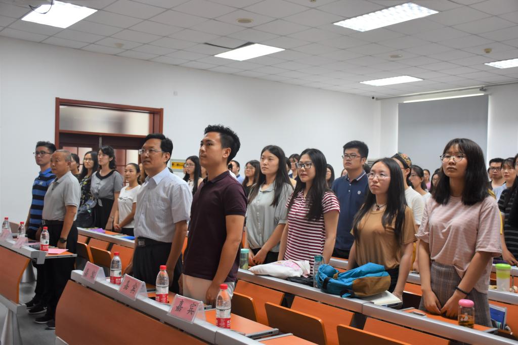薛佩军代表外院党委发言。他在祝贺大家加入中国共产党的同时也给大家提出了几点希望:多了解政治,多关注国情;增强文化自信;自觉维护以习近平同志为核心的党中央的权威和集体领导。此外,他还鼓励大家要把实践与理论相结合,为中华民族的伟大复兴而不断奋斗。最后,大会在全体党员的国歌奏唱中落下帷幕
