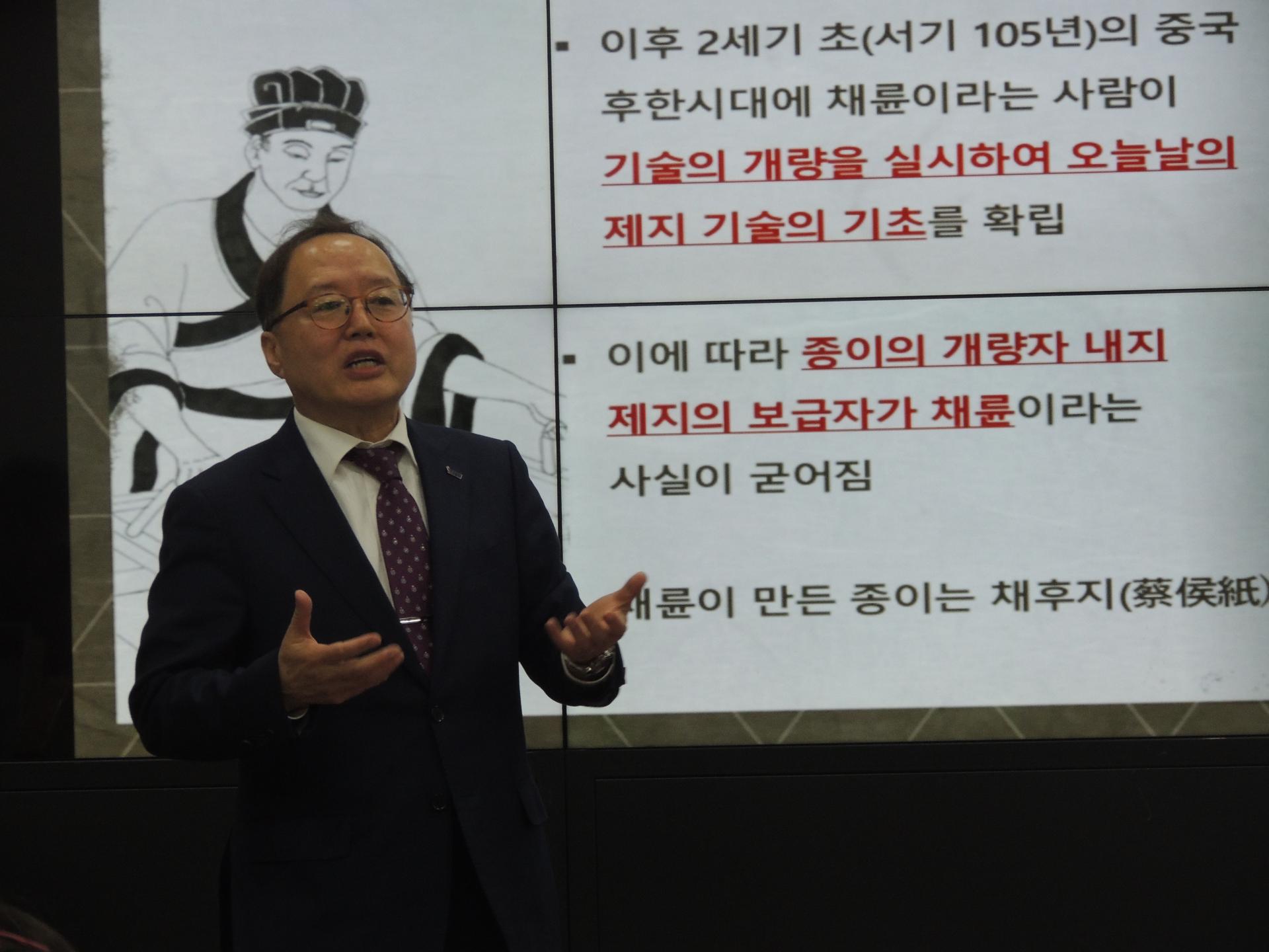 接着,赵骏衡教授结合历史记载深入分析了纸文化的传播与发展。在亚洲,两汉交替之际,大批中国百姓为避乱涌入朝鲜半岛,造纸技术随之传播。据《日本书纪》记载,朝鲜半岛的两个僧人在610年将造纸技术传入了日本。教授还提到,在汉灵帝时期,山东省东莱县出现了一位造纸家“左伯”,他造出了有名的“左伯纸”,这种纸传到了长江流域,后经丝绸之路西传。据《新唐书》记载,唐朝与大食国发生战争,唐军中的部分造纸工匠被大食军俘虏,造纸技术由此传播到中亚乃至欧洲。之后,赵骏衡教授结合造纸工艺指出,中国造纸技术传播到东亚其他国家后发生了变化,并分析了韩国和日本造纸技术与中国造纸技术的差异与各自的特色。