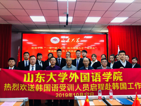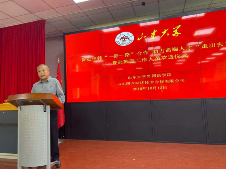 10月12日上午,“促进中韩‘一带一路’合作助力高端人才‘走出去’”暨赴韩工作人员欢送仪式在洪家楼校区举行。学院党委委员、组织员周俊基,山东国立经济技术合作有限公司总经理侯永智、韩语系副教授李成道、教师全源海、继续教育秘书董然、即将赴韩工作的14名学员及在训学员和相关媒体记者出席欢送仪式。