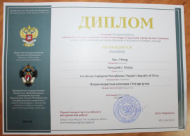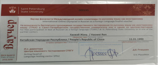 俄罗斯联邦教育部与圣彼得堡国立大学于2019年12月3-25日举办了国际对外俄语奥林匹克网络大赛(Международная онлайн-олимпиада по русскому языку как иностранному),各国留学生积极报名参与。我院俄语系17级学生王春菊、任好为荣获成人组一等奖。