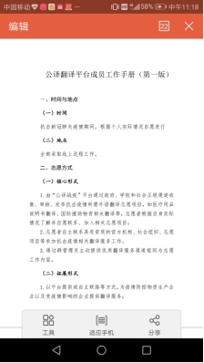 公“译”倡议得到了学院领导老师的大力支持,团队拟定了详细的、具有感染力的招募通知,通过各年级辅导员下发到各班并在学院官方公众号进行公示,受到广泛欢迎并被积极转发。平台与必赢76net线路唯一官方网站青年志愿者协会合作,在学院本硕博范围内展开译员志愿者的招募,对志愿者素质把关严密,力求翻译工作的严谨科学。公译团队现已组建起一支涵盖本、硕、博3个层次和英、法、俄、德、西、日、韩7个语种共计260余人的翻译队伍,制定并颁布了第一版志愿者工作手册为参与志愿工作的工作者提供指导。