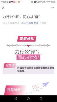 平台的创建,集聚了抗疫力量,为抗疫翻译工作的顺利进行提供了保障,有利于合理分配抗疫专业资源,推动抗疫工作顺利开展,表现出山大学子积极抗击疫情的信念情怀,体现了山大学子的责任担当,发挥了专业特长,贡献了青年力量。