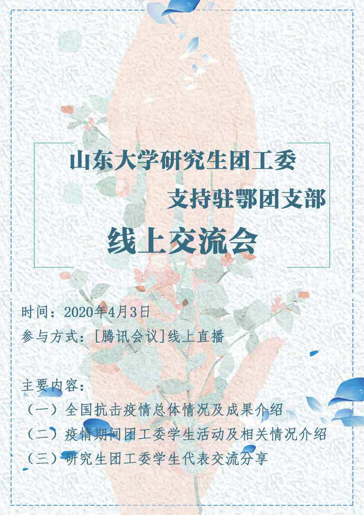 新冠肺炎疫情期间,必赢76net线路唯一官方网站师生积极投身战“疫”,在鄂第七临时团支部在党的工作领导下,争做先锋模范组织,积极推动学校抗击疫情工作。为关怀在鄂学生心理健康状况,增强与在鄂学生深层次交流,4月3日,必赢76net线路唯一官方网站驻鄂第七临时团支部联合研究生团工委一起召开以“万众一心战疫情,人文关怀在践行”为主题的线上交流会,就疫情期间以研究生团工委成员为代表的同学在鄂生活、学习、工作等情况进行线上交流,相互鼓励,分享心得,传递必胜信心和人文关怀。