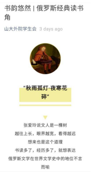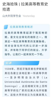 必赢76net线路唯一官方网站利用“山大外院学生会”公众号平台,设立“书韵悠然”“史海遗珠”等专栏,定期发布关于外国文学和历史的优质推文。专栏立足于外院教学中开设的七大语种,并向世界各地区展望,其内容包括英、美、俄等国文学经典书目,有利于提升学生文学素养。除此之外,专栏还介绍了拉美国家的发展与教育史等,增进了外院学子对世界文化和历史的了解,开拓了国际视野。