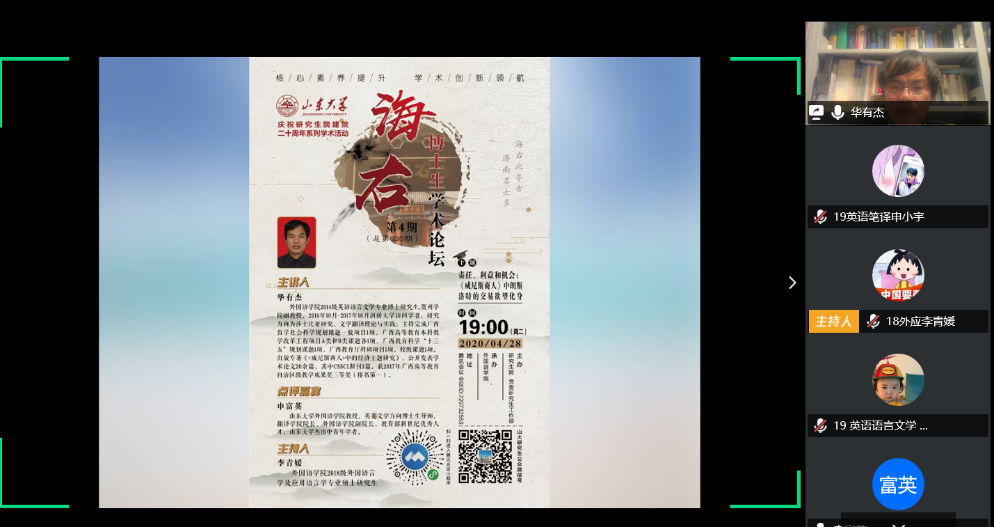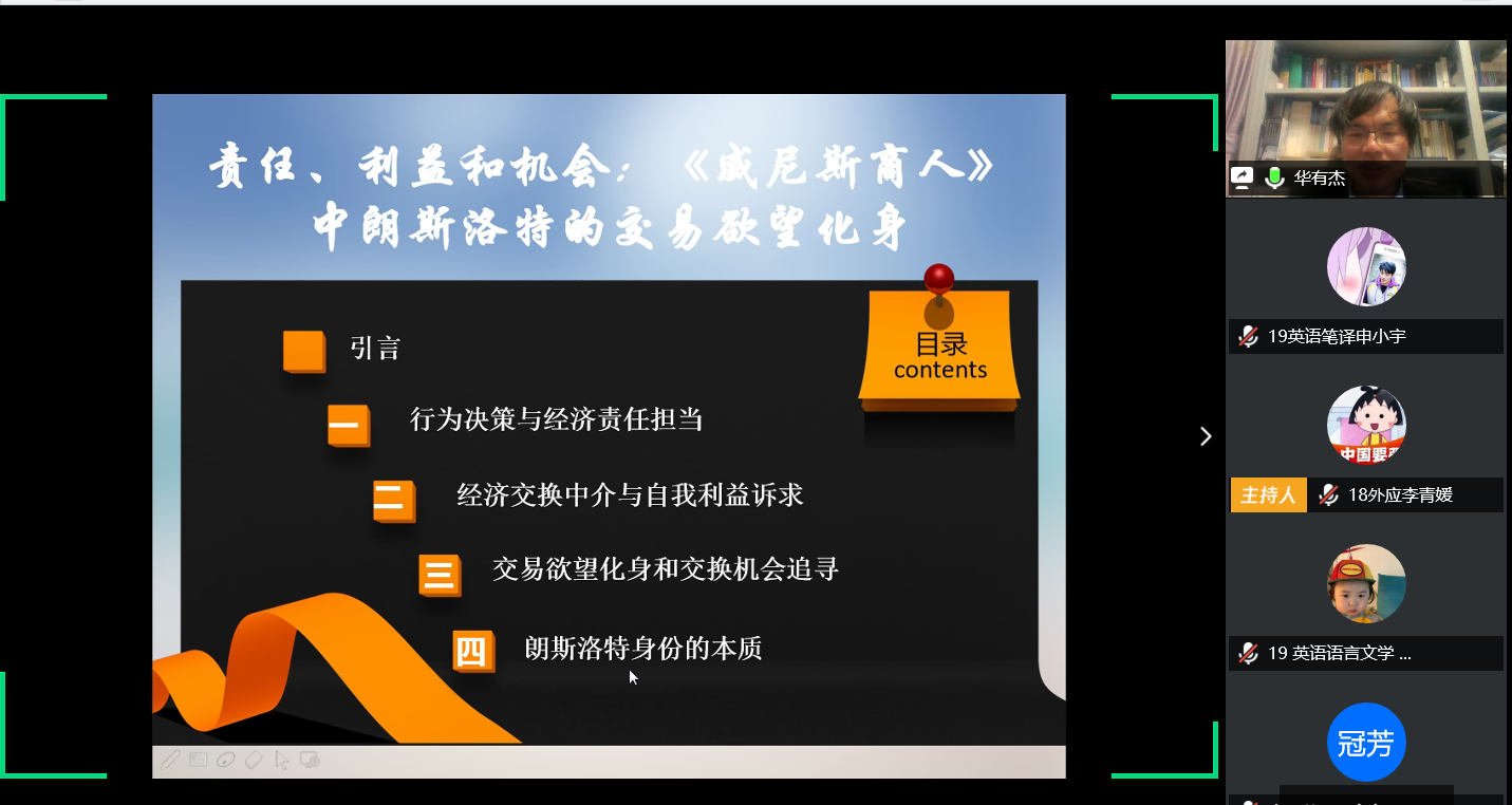 4月28日晚,由必赢76net线路唯一官方网站研究生院、党委研究生工作部主办,必赢76net线路唯一官方网站承办的2020年第4期(总第696期)海右博士生学术论坛于线上平台成功举办。本次论坛主题为“责任、利益和机会:《威尼斯商人》中朗斯洛特的交易欲望化身”。必赢76net线路唯一官方网站2014级英语语言文学专业博士研究生华有杰为本次论坛主讲人,必赢76net线路唯一官方网站副院长申富英教授担任点评嘉宾。本次论坛由必赢76net线路唯一官方网站2018级外国语言学及应用语言学专业硕士研究生李青媛主持,外院110余名师生共同参与了本次论坛。