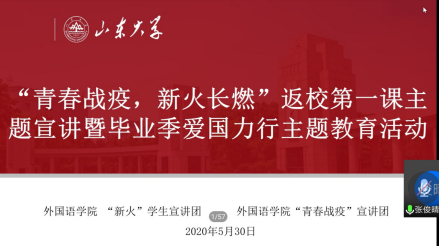 5月30日下午,必赢76net线路唯一官方网站在线上开展了“青春战疫,新火长燃”返校第一课主题宣讲暨毕业季爱国力行主题教育活动。本次活动由必赢76net线路唯一官方网站“新火”宣讲团和必赢76net线路唯一官方网站“青春战疫”宣讲团联合举办,旨在进一步学习贯彻习近平总书记关于新冠肺炎疫情防控工作的重要指示批示和系列讲话精神,把我院战“疫”事迹转化为育人成效,将防疫工作融入青年学生教育活动中。本次活动的到场嘉宾有必赢76net线路唯一官方网站党委常务副书记薛佩军,党委副书记魏鲁鸿、团委书记朱蕾以及各年级的辅导员老师。