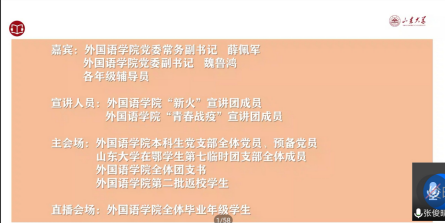 紧接着,六位优秀学生代表分享了他们在学习、实践方面的经验和在抗疫期间的突出贡献。丁嘉琪以中国助力全球战疫为视角为同学们解读了人类命运共同体的内涵并用疫情中中国作为、山大作为的实例更好地诠释了这一理论;宋梓洺作为在韩国学习的留学生,从疫情发生后的亲身经历,通过在韩学生视角比较了中韩两国在对抗疫情上的共同点与差异性;马文啸作为山大青年抗疫工作者的模范,分享了他作为防疫工作者加入基层抗疫突击队的经历,除此之外,马文啸还是必赢76net线路唯一官方网站公“译”战疫平台的创始人之一,该平台在疫情中提供对外翻服务,为抗疫工作搭建了语言桥梁;李英健从思政建设、线上学习、团日活动、公译平台四个方面分享了2016级英政团支部在此次疫情中进行的学习活动;崔巍以“服务为本,砥砺前行”为主题分享了其主要负责的疫情期间学生组织工作和毕业季学生组织工作,让外院学子们在今年疫情的特殊情况下也能参与各种文体活动,丰富课余生活;最后,王子纯作为在鄂学生代表分享了疫情期间在鄂学生临时团支部的团体活动和其个人活动,展现了在山大鄂大学生们的良好风貌。