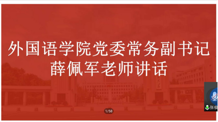 会议伊始,薛佩军就目前的战疫情况发表了讲话并对必赢76net线路唯一官方网站师生及职工的抗疫防疫工作给予了高度肯定。薛佩军指出,中国在此次疫情中的作为体现了党奉行的人民至上的理念,也取得了来之不易的成果,与此同时,必赢76net线路唯一官方网站在疫情面前也第一时间作出了反应,对师生状况进行了全面摸排。薛佩军还提到,作为90后,外院的学子应当将个人成长与国家复兴联系起来,将个人理想与国家未来联系起来,担负起外语人应承担的责任。
