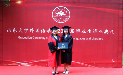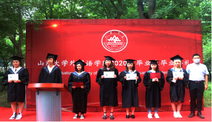 本次典礼主会场设在中心校区音乐厅,外国语学院1名优秀毕业生代表、2名荣誉学位获得者参加典礼并上台领奖,12名毕业生代表班级接受学位证并合影留念。