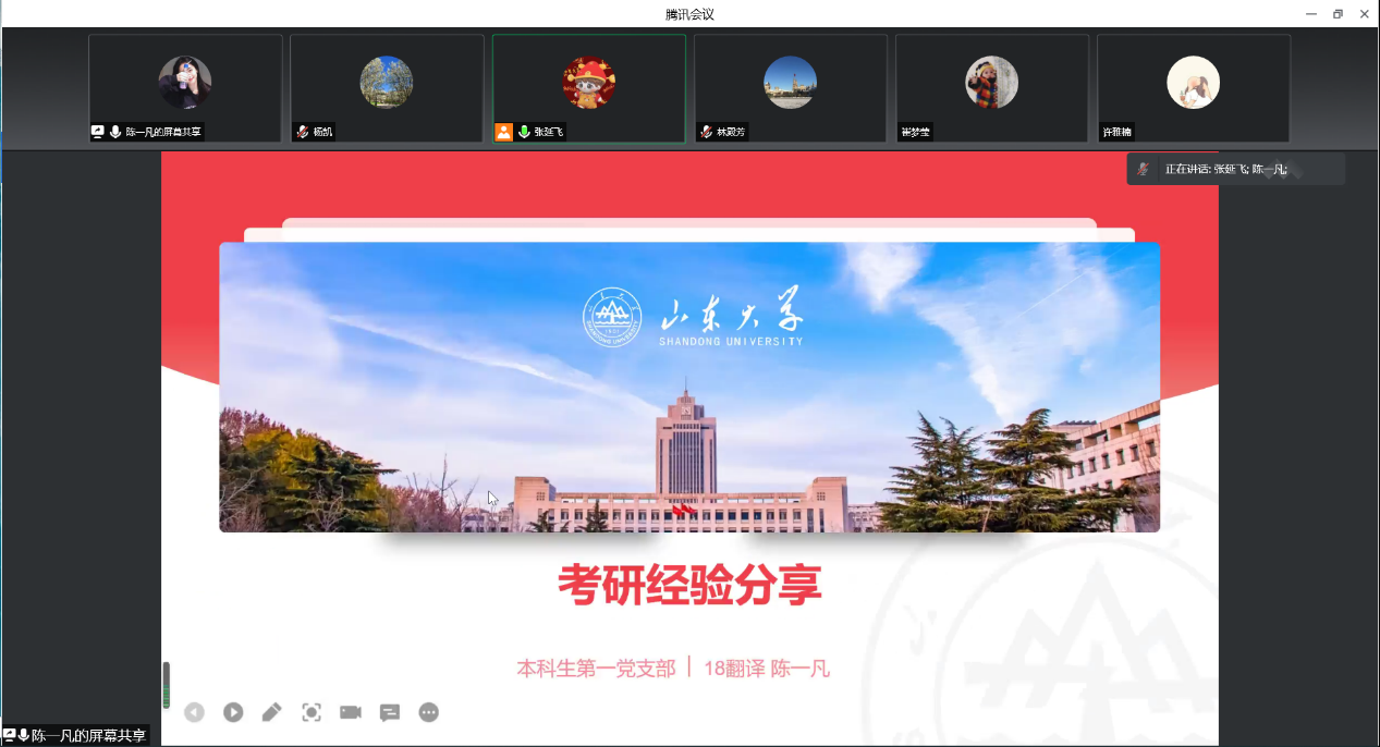 分享环节,任珏辰从个人经验出发,介绍了保研过程中夏令营的申请、入营,文书材料的提交,夏令营的考核等方面的内容,并强调同学们应该确定自身兴趣,选好心仪学校,懂得取舍。陈一凡从“找准定位”“选对方法”“劳逸结合”三个关键词入手分享了自己考研成功的经验。她强调要客观找准自己定位和适合自己的学习方法,提高学习效率。于娜分享了自己备考研究生的经验,并主要从研究生调剂方面分享了自己准备调剂的相关经验。贾云清从申请流程、准备材料、准备面试等方面分享了自己成功申请英国硕士的经验,并对拿到录取通知书后的注意事项进行了说明。任仰卿分享了自己考公的经验与教训,并强调要综合评估自己是否适合考公,选择之后一定要下定决心。
