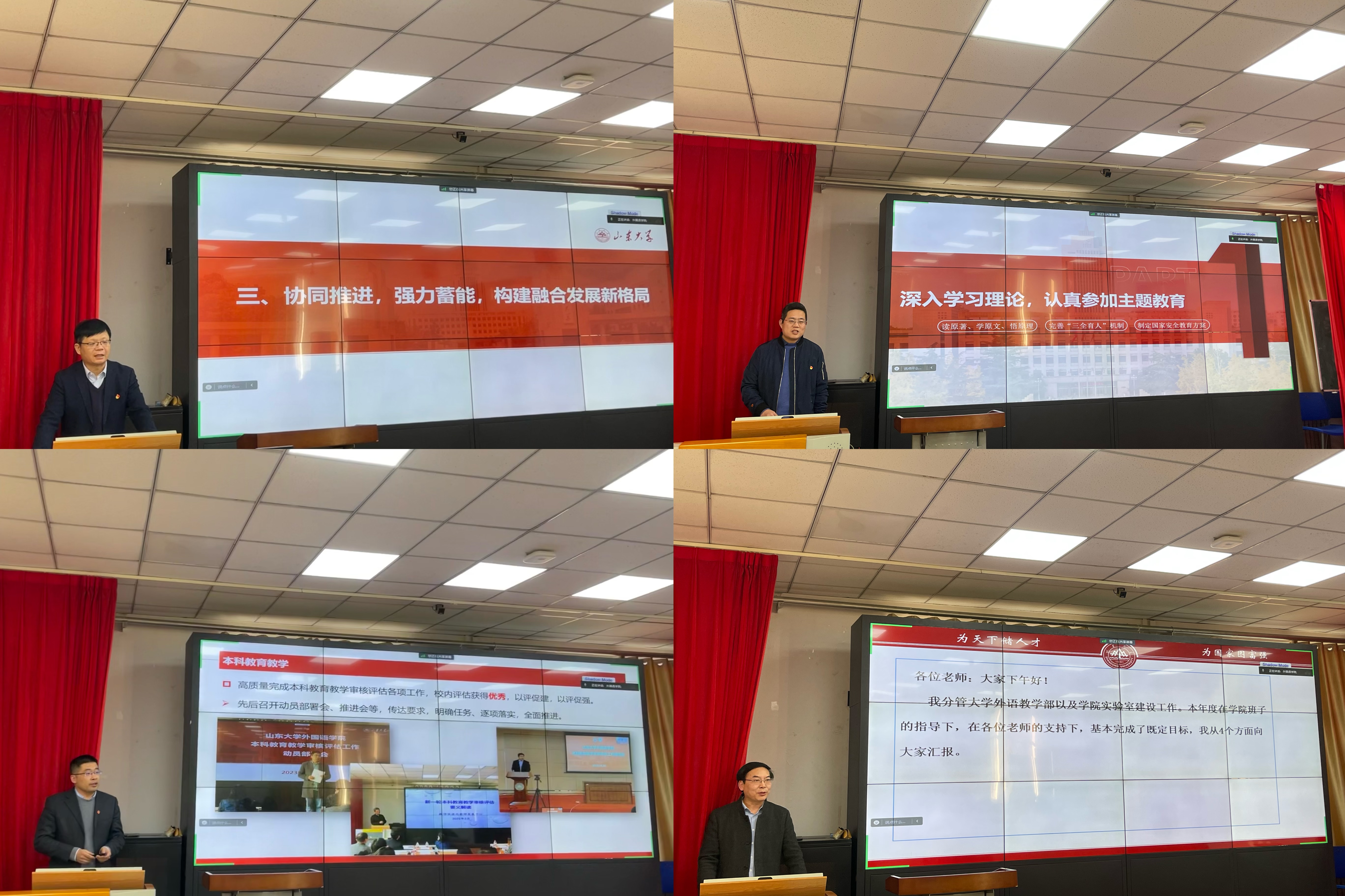 从党建引领、学科建设、教学改革、立德树人、服务保障等方面全面总结了学院年度工作成效,分析了存在的问题与不足,提出了下一步工作思路和举措。2024年,聚焦加快建设担当中华民族复兴大任的世界一流大学,全面贯彻教育、科技、人才“三位一体”的战略部署,面向“健康中国、讲好中国故事、构建中国话语体系”等国家战略需求,全面把握国际学术前沿、国家战略需求和山东经济社会发展需要,超前布局战略新兴交叉学科方向,持续深化教学改革、着力提升立德树人成效,推动各项发展战略提档升级。