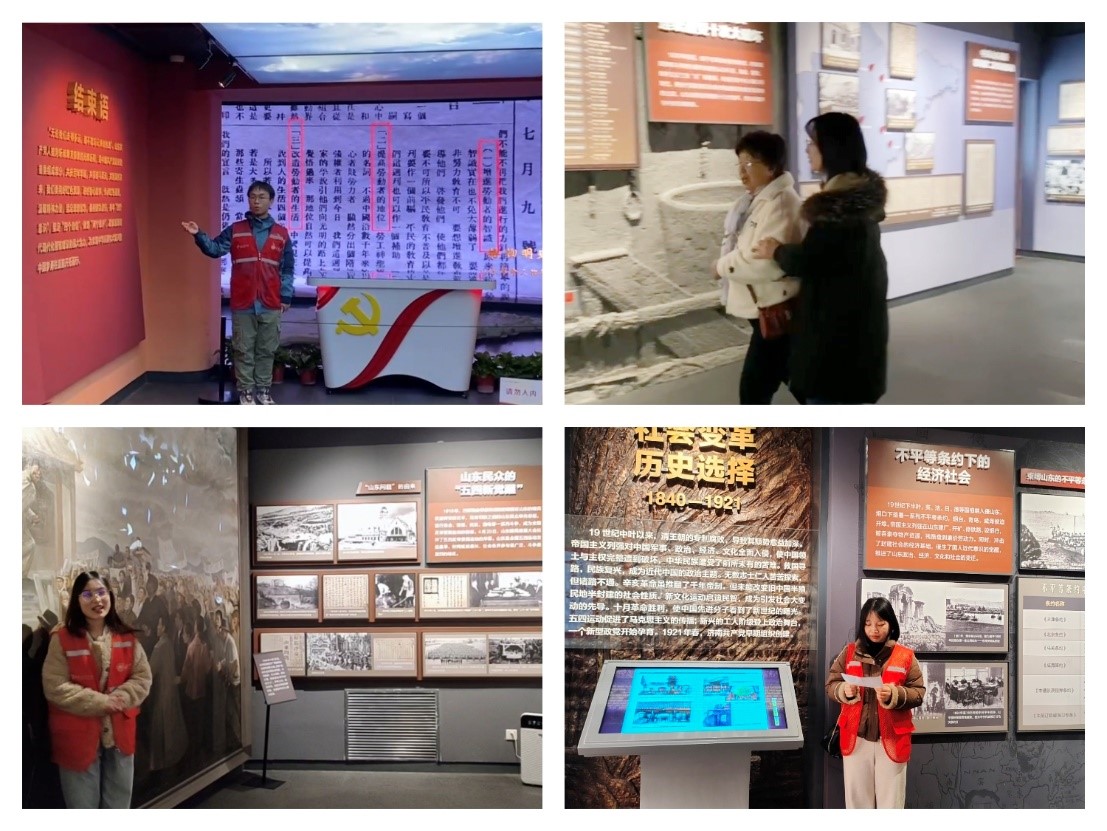 孟春的济南,暖阳相照,泉水欢畅。坐落于五龙潭公园旁的中共山东早期历史纪念馆,在绿树掩映下,显得格外庄重。上午9时,比较文学与跨文化研究团队党支部与小语种专硕党支部的同志们步入纪念馆参观。除序厅、尾厅外,纪念馆共分为6个部分,分别为“社会变革、历史选择”“点燃星火、彰显初心”“工农运动、异军突起”“土地革命、前仆后继”“信仰弥坚、铁血担当”“重建省委、抗日救亡”。1007平方米的展示区内,一幅幅老旧的图片、一件件珍贵的文物、一张张翔实的图表、一个个逼真的复原场景,全面展示了山东党组织的早期历史,展示了革命先驱的光辉事迹,彰显了山东党组织始终敢于斗争、敢于胜利的鲜明品格。“历史是最好的教科书。”中共山东早期历史,是一部铁血担当的壮丽史诗,山东共产党人披荆斩棘、艰难开拓,将共产主义星火遍播齐鲁。