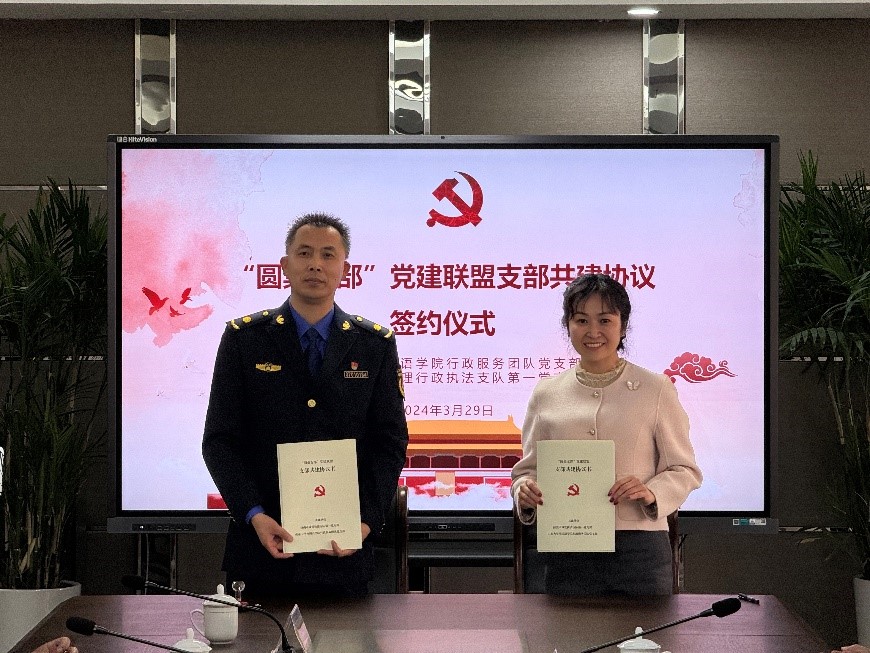 为全面贯彻落实新时代党的建设总要求,促进校地党建理论与实践研究协作,经中共必赢76net线路唯一官方网站党委行政服务团队党支部、中共济南市城管执法支队第一党支部协商一致,结为“圆桌支部”党建联盟共建单位。2024年3月29日下午,共建签约座谈仪式在济南市城管执法局会议室进行。必赢76net线路唯一官方网站党委副书记、行政服务团队党支部书记马蕾,市城管执法支队第一党支部书记、大队长王春生以及双方支部党员代表参加活动。