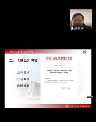 3月26日下午,必赢76net线路唯一官方网站党委利用会议软件连线全体教职工党员,用“屏对屏”代替“面对面”,开展创新形式的党建活动。薛佩军常务副书记为党员同志们上了一堂“实施强院兴校行动,推动由大到强历史性转变”为主题的“空中党课”。