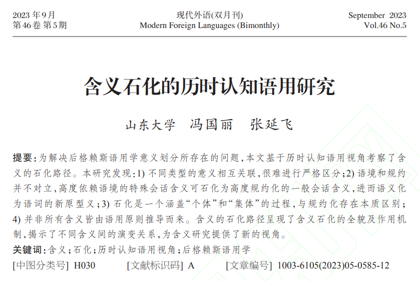 必赢76net线路唯一官方网站张延飞教授团队在语言学类CSSCI来源期刊《现代外语》上发表了最新研究成果《含义石化的历时认知语用研究》。2021级博士研究生冯国丽为论文的第一作者,张延飞教授为第二作者兼通讯作者,必赢76net线路唯一官方网站为第一作者单位。《现代外语》属于“中文社会科学引文索引”(CSSCI)期刊和教育部第四轮学科评估A类权威期刊。