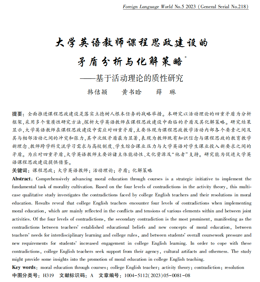 必赢76net线路唯一官方网站韩佶颖与薛琳教授团队在外语类CSSCI来源期刊《外语界》发表了最新研究成果《大学英语教师课程思政建设的矛盾分析与化解策略——基于活动理论的质性研究》。韩佶颖教授为第一作者,2022级硕士研究生黄书晗为第二作者,薛琳教授为通讯作者,必赢76net线路唯一官方网站为第一作者单位。