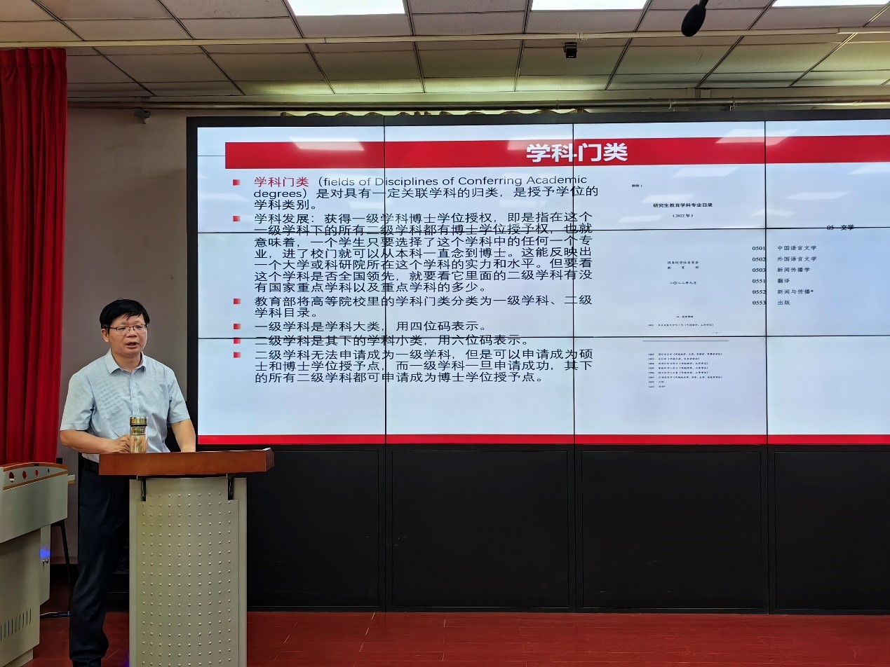 马文副院长主讲《外语学科发展与“十四五”规划》。马院长为管理人员普及了学科门类相关知识,学科与专业的区别,怎样进行学科建设等。他介绍了我院学科设置的优势和特色,分析了我院在师资力量、国际交流、人才培养、科学研究、平台基地、社会服务等方面的基本情况、存在的主要问题以及“十四五”发展规划的总体目标和发展思路。他指出,我们要牢牢把握“双一流”建设的重大机遇,坚持人才强院、学术兴院,以学科建设为抓手,以人才培养为中心,以学科研究基地建设为手段,以科研创新团队建设为重点,紧密围绕建设“大人才、大团队、大平台、大成果”为中心,进一步提高学科层次、教师科研水平和学科的核心竞争力。