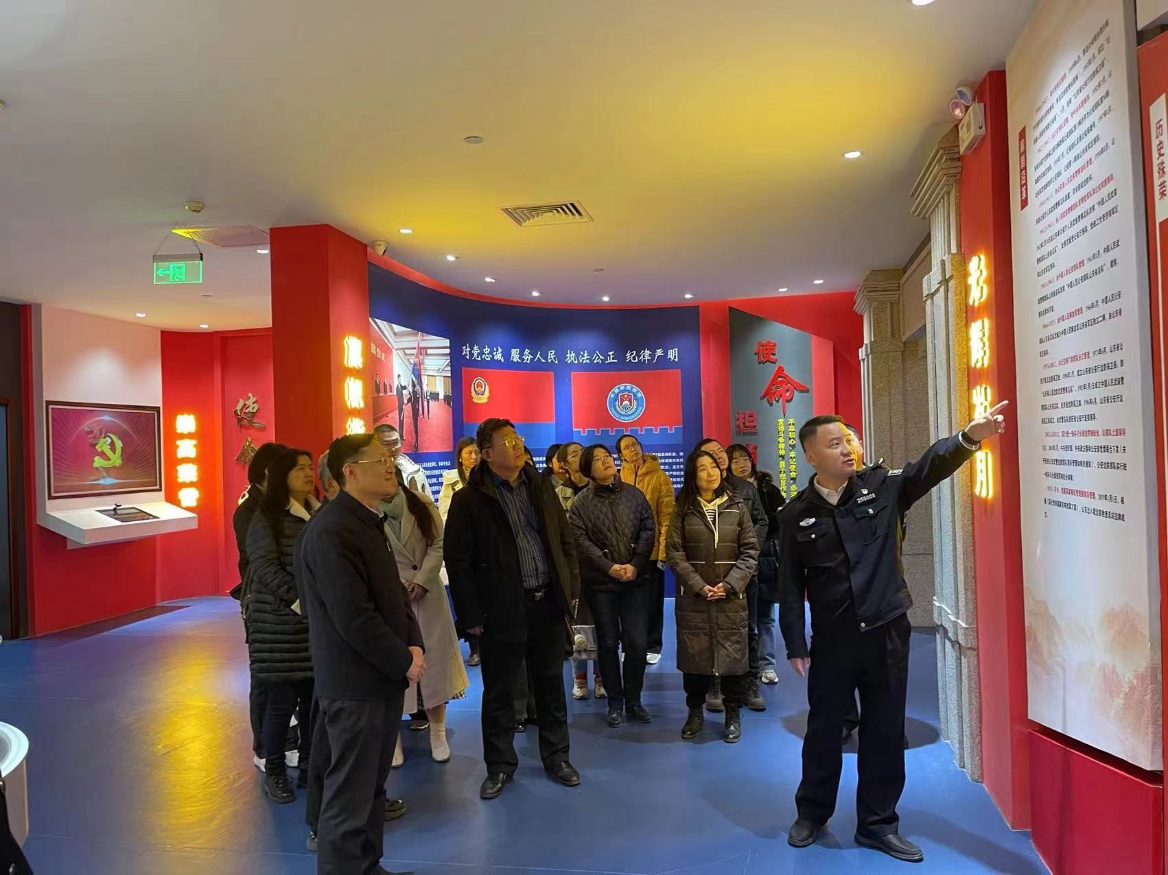 在工作人员的带领下,全体人员集体参观了山东出入境边防检查总站“党员政治生活馆”。该馆于2021年正式建成、开馆启用,为全省边检机关2000余名党员民警职工丰富党建活动、深化党性锤炼提供了全新载体。整个场馆占地约1000平方米,主要设置追根溯源厅、学习引领厅、对照检视厅、党性锤炼厅、使命担当厅五大区域,配套序厅、尾厅两个辅助区域。