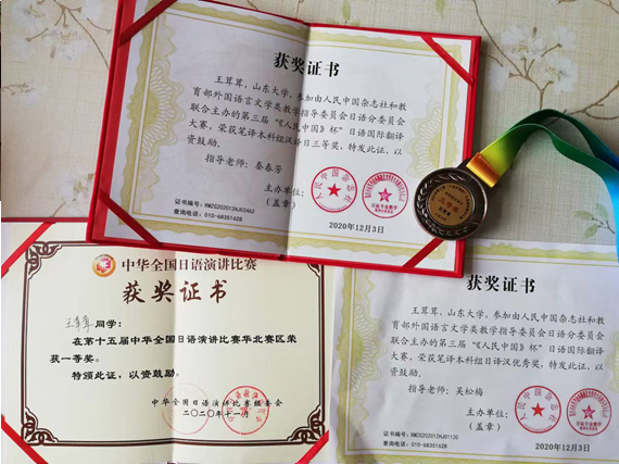 2019年的11月,在日语系老师的指导下,我和其他两位同学代表山大日语系,在笹川杯全国大学生日语知识竞赛中,从全国100多所高校中脱颖而出,获得了三等奖。每一个成绩的背后都有日语系给我的鼓励与帮助。学弟学妹们,尽管来,放心来,让日语帮助你成长,帮助你成功,让你也拥有属于自己的未来。