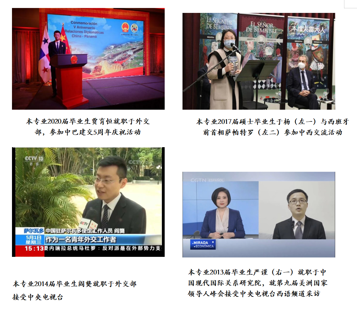 本专业毕业生凭借扎实的语言功底、出众的跨学科优势、较强的综合竞争力赢得就业单位的广泛赞誉。建系以来,本专业近500多名毕业生,从事外交、经贸、文化、科研等领域工作,为中国对西语国家研究、中国与西班牙语国家的政治、经济、文化交流做出积极贡献。专业就业率接近100%,自2011年以来有超过30名学生保送成功进入北京大学、北京外国语大学、上海外国语大学、北京对外经贸大学攻读硕士学位,受到全国各个知名西语硕士点教学单位的高度评价。此外,作为外交部西语外交人才培养单位,本专业已有近2010名学生通过遴选进入外交部工作,此成绩列居综合类高校西语专业前茅。