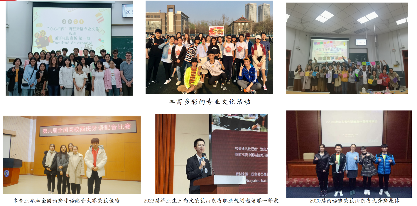 本专业依托必赢76net线路唯一官方网站“综合性、强学科”的突出优势,积极探索学科交叉的复合型“外语+”人才培育,经过数十年的不懈努力与探索,已经形成“自交叉--内交叉---外交叉”三维一体的复合培养路径。首先,专业课程建设中,通过建设文化、国情、政治、经贸等课程,形成西班牙语专业自交叉,积极对接国际交流项目,拓展语言专业知识复合传授路径;其次,依靠必赢76net线路唯一官方网站雄厚的外语专业优势,不断开拓外语类专业内交叉,积极参与“主专业+微专业”双驱动培育模式建设,鼓励学生参加“国际组织与跨文化交流”、“国学外译与传播”等微专业学习,积累跨学科知识结构,提高综合竞争能力;依托必赢76net线路唯一官方网站“综合性、强学科”的突出优势,促进语言与非外语学科的交叉融合,构建外交叉培养路径,鼓励学生申请第二专业学习,“西班牙语+二专业”培养模式已趋向成熟,2024年起,本专业设置“西班牙语+国际传播”复合培养模块,强化专业复合,提高学生的综合竞争能力。本专业毕业生凭借西班牙语+第二专业优势,成功进入哈佛大学、清华大学、北京大学、南京大学、复旦大学、中国政法大学、北京师范大学等国际知名高校进行国际教育、国际新闻、法律、对外汉语、金融等专业硕士学习。